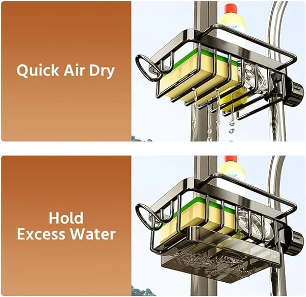 ✅️ Не само в кухнята:Поддържателят за гъба за смесител може да се използва не само на мивката, но и в банята, за да съхранявате шампоан, сапун и други предмети, да се отървете от безпорядъка и да поддържате мивката и плота подредени. Този държач за гъба за смесител е много подходящ за кухнята и банята.