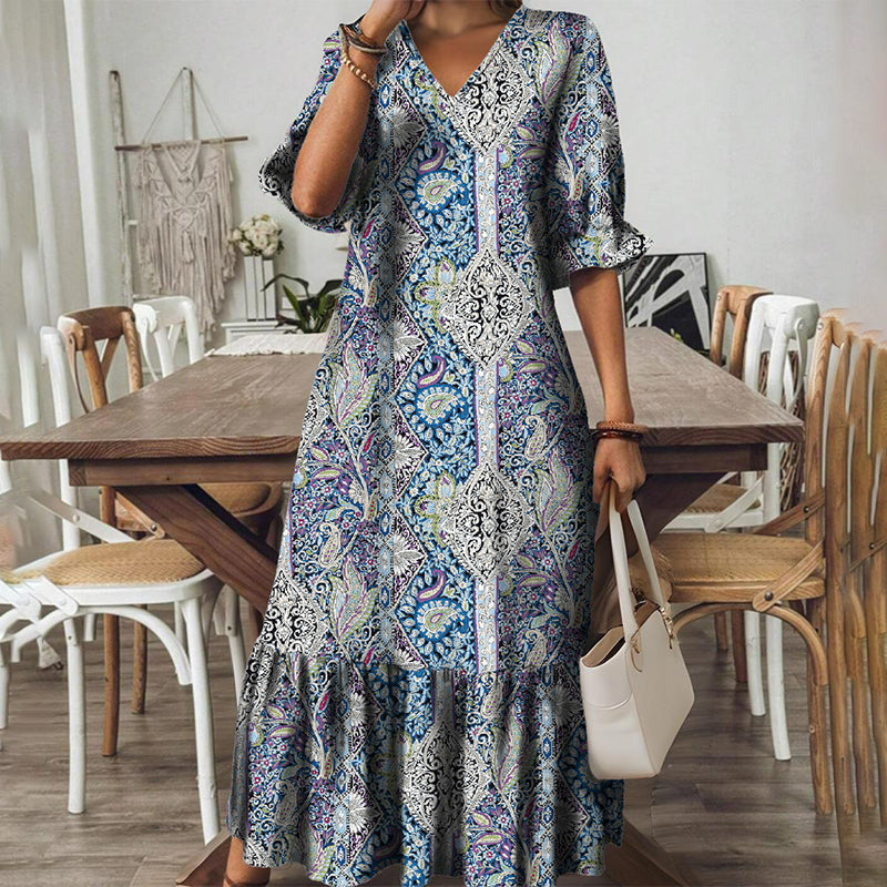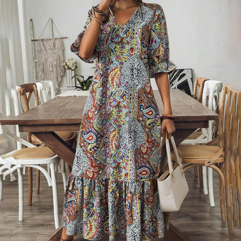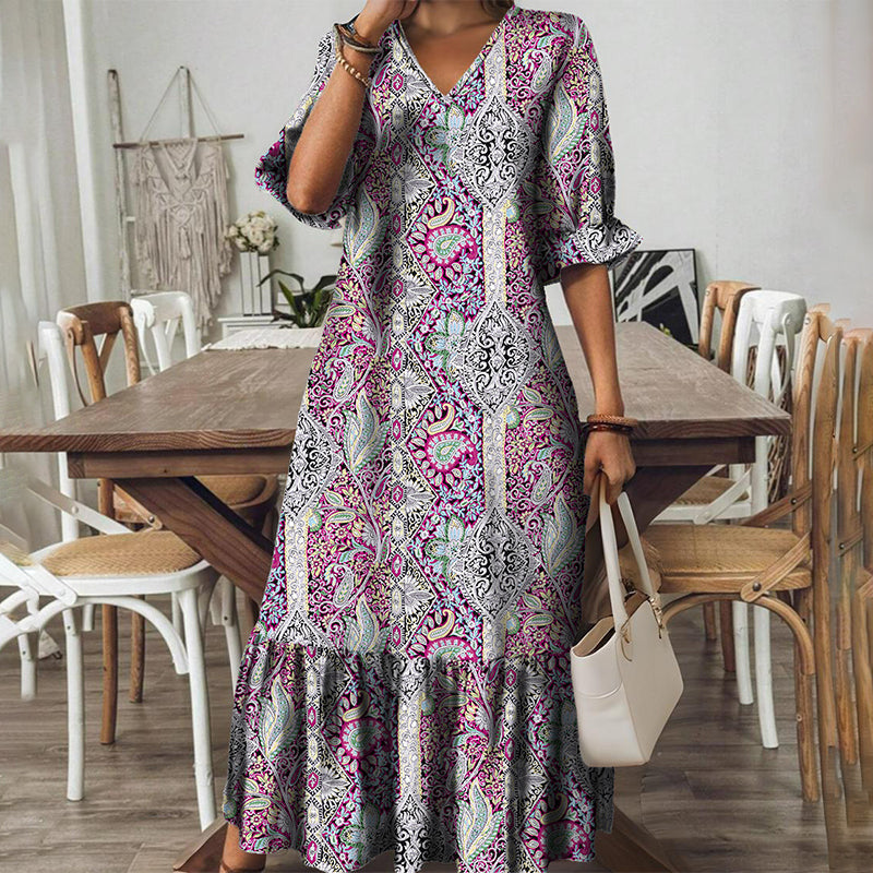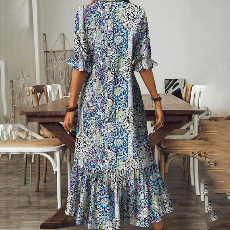 Етнически щампи: Ярките щампи на тази рокля са цветни, хармонични и етнически, излъчващи артистичен талант и глобална привлекателност. Дръзкият, привличащ вниманието дизайн показва индивидуалност и увереност, което я прави забележителна.