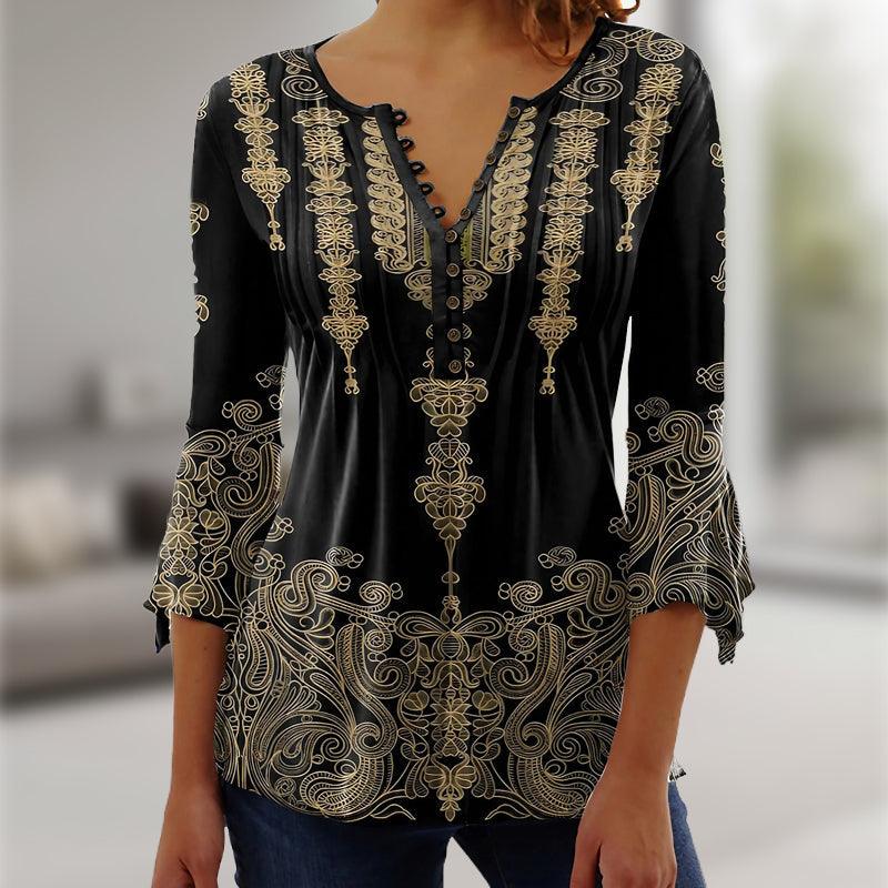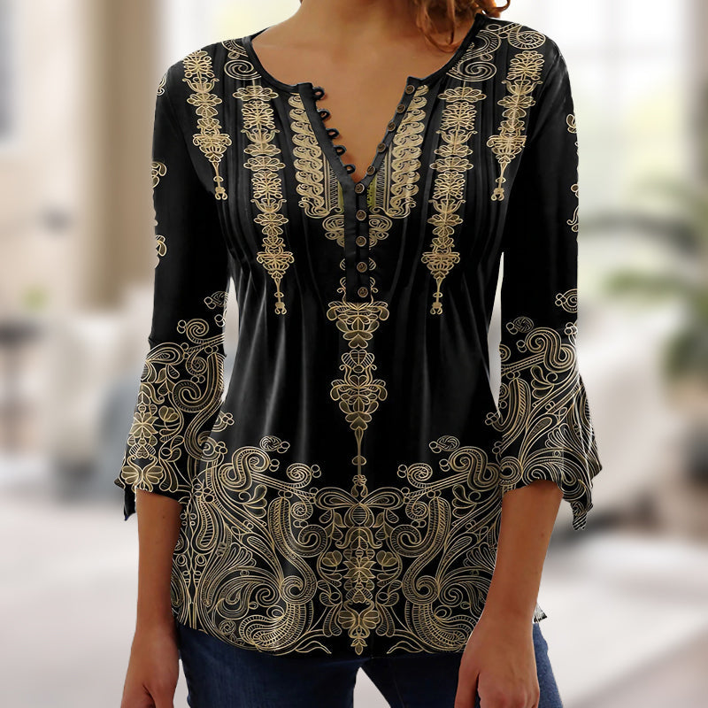 РАЗШИРЕНИ РЪКАВИ – Добавят движение и чар. Деликатните разширени ръкави придават лек, бохемски привкус на блузата. Те не само подобряват дишането и комфорта, но и създават меко движение, докато вървите. Дизайнът на широките ръкави добавя комфорт за ежедневно носене, като същевременно запазва структурата и елегантността.